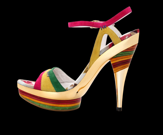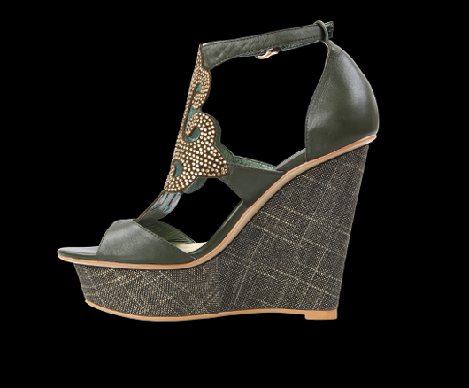 Je dekorována orientálním vzorem se zlatým odleskem. Svrchní část z pravé kůže – kozinky s výrazným ornamentem. Klín je potažený hrubou textilií. Vnitřní část a stélka: pravá kůže. Podešev: ABS pryž. Výška klínu 12 cm, výška platformy 4,5 cm, oblouk 7,5 cm. Vysoce módní obuv.Délka stélky je uvedena v milimetrech u každé velikosti za lomítkem.