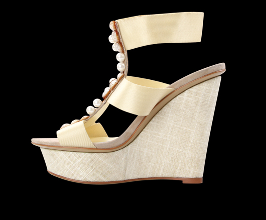 Je zdobená pásem perel a kamínků. Svrchní část: textilní pásky. Klín je potažený hrubou textilií. Vnitřní část a stélka: pravá kůže. Podešev: ABS pryž. Výška klínu 12 cm, výška platformy 4,5 cm, oblouk 7,5 cm. Vysoce módní obuv. Délka stélky je uvedena v milimetrech u každé velikosti za lomítkem.