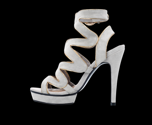 Její hlavní část tvoří silueta připomínající hada obtočeného kolem lýtka. Svrchní část z pravé velurové kůže - kozinky. Vnitřní část a stélka: pravá kůže. Podešev: černá pryž. Výška podpatku12 cm, výška platformy 2,5 cm, oblouk 9,5 cm. Vysoce módní obuv.Délka stélky je uvedena v milimetrech u každé velikosti za lomítkem.